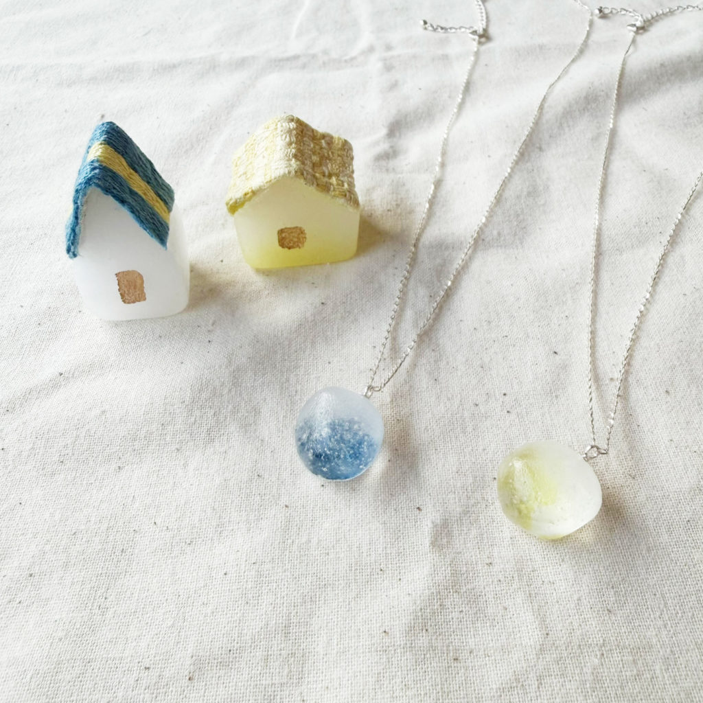 小さなおうちのオブジェ「おかえり」や新作のガラス×草木染めのジュエリーが並びます。